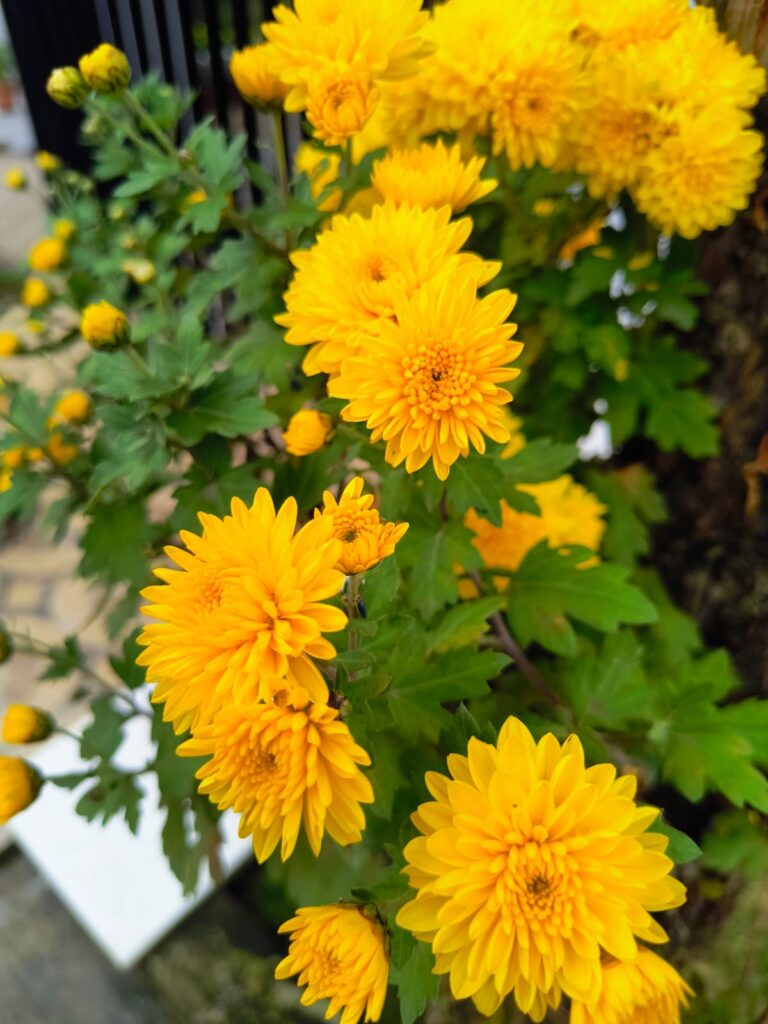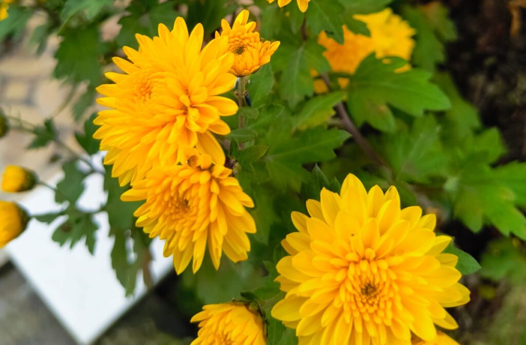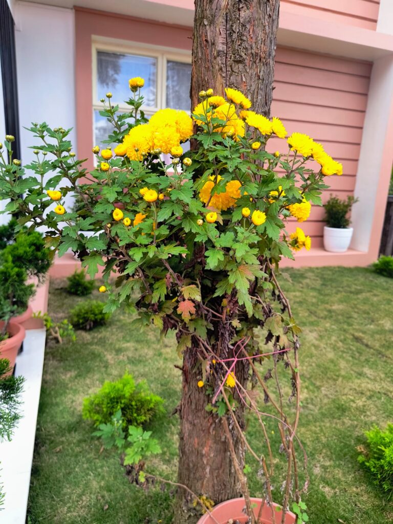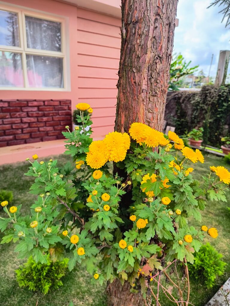 I paused by the tree where yellow chrysanthemums had burst open โ€” cheerful, unbothered, alive. Their petals looked like tiny suns, glowing against the bark.