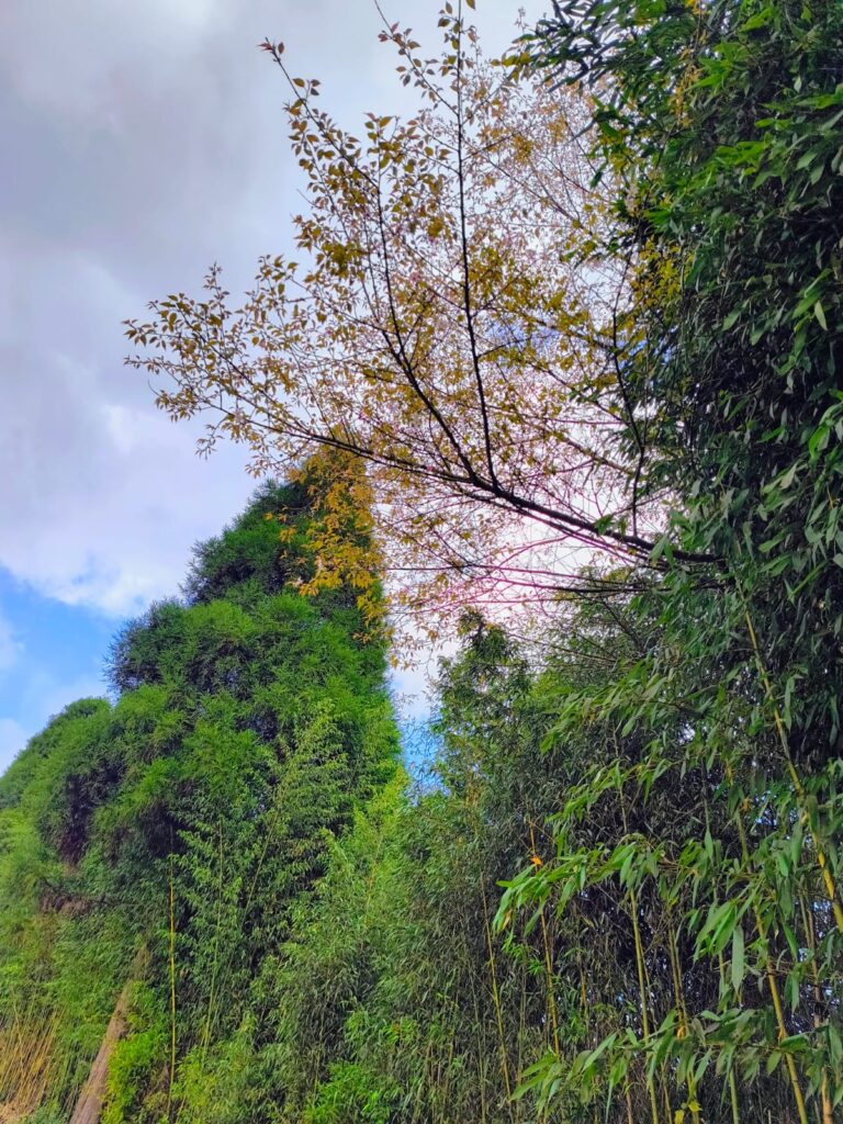 The air hummed faintly with the sound of bees and the distant chatter of birds. Above me, the tall bamboo swayed gently.